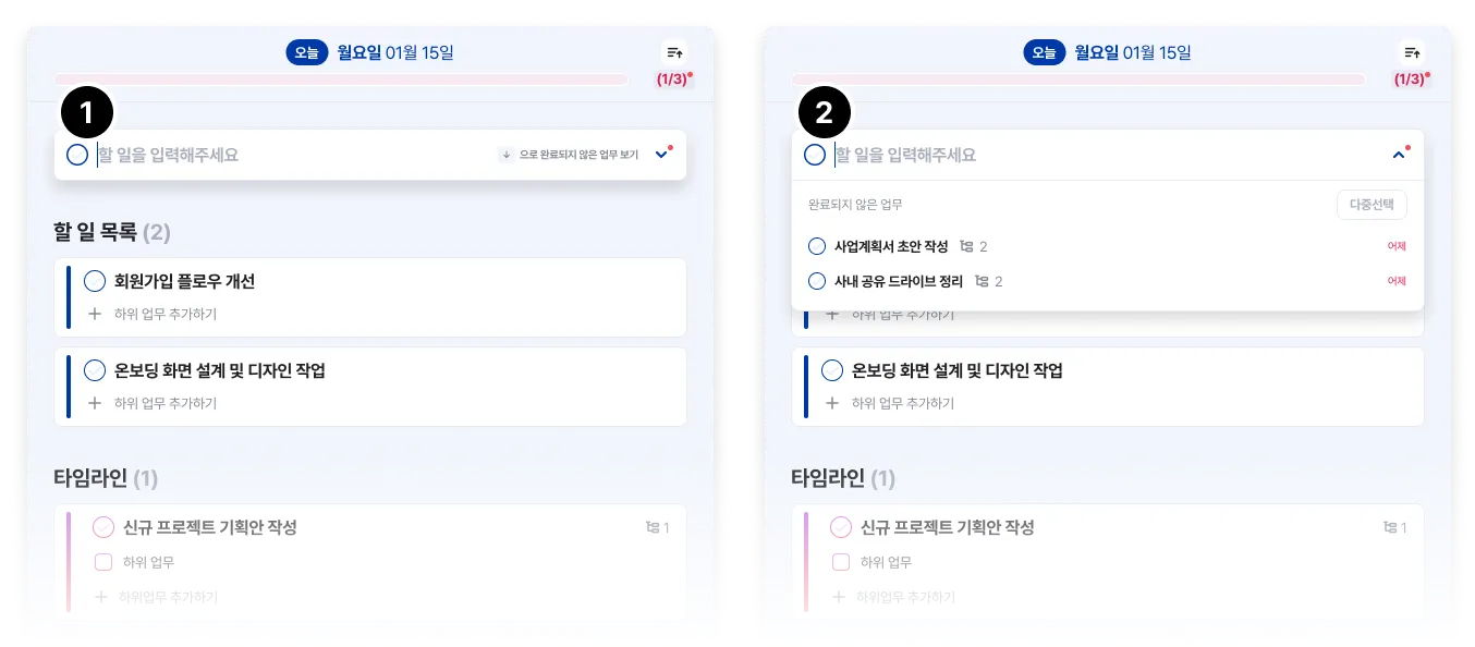 할 일 입력하기 전, 우측의 아이콘이나 단축키 ↓ 를 눌러 완료되지 않은 업무 목록을 확인할 수 있습니다.